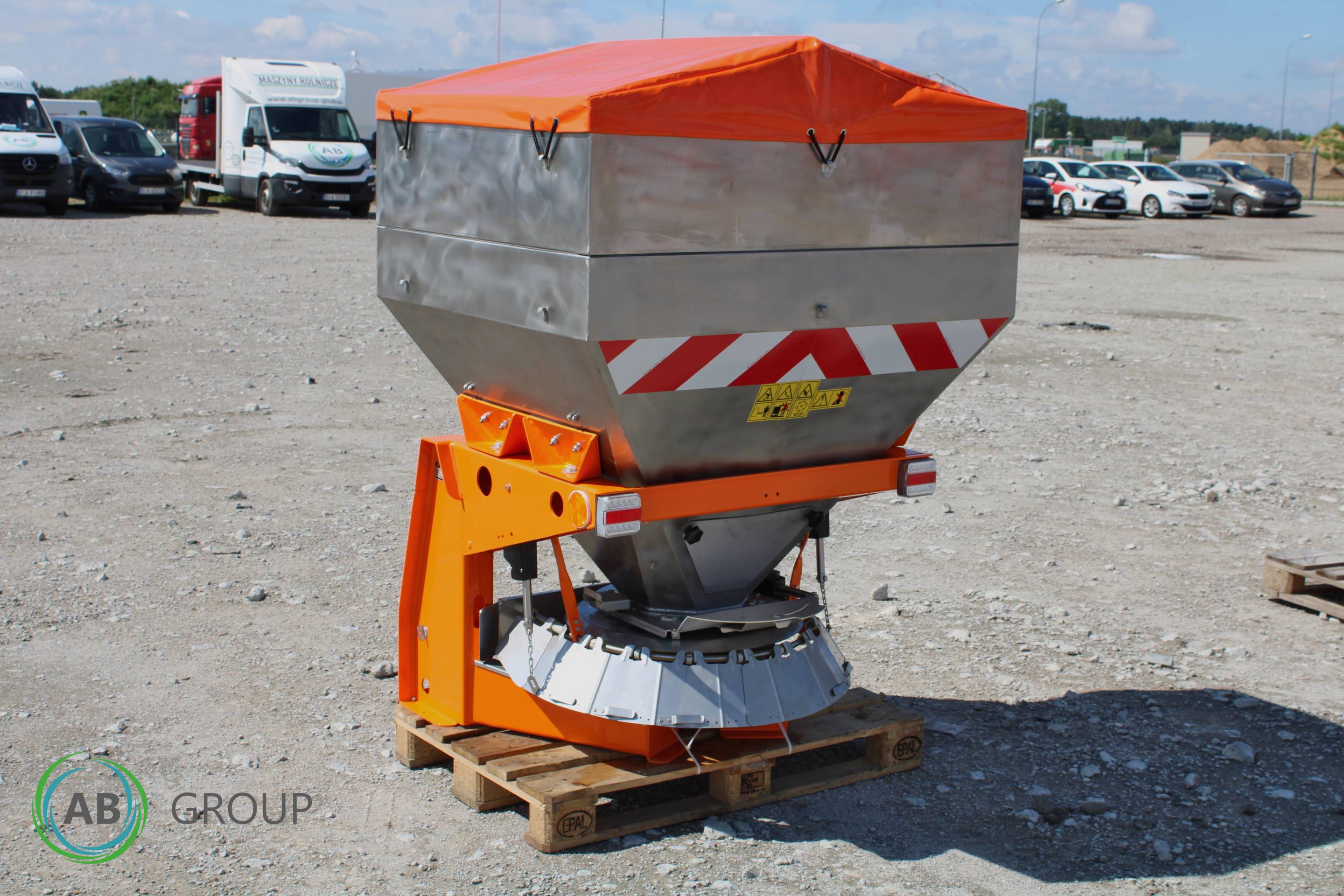 - Trémie, agitateur, disque d'épandage avec pales, protections et dispositif de bordure en acier inoxydable résistant aux acides,