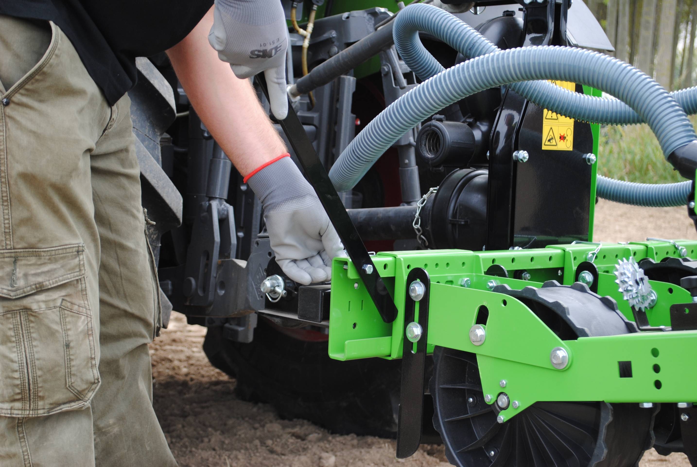 Diese pneumatischen Sämaschine ist speziell, da man den gwünschten Abstand zwischen den Einheiten sehr einfach einstellen kann. Dank eines Schieberahmens ist es nun möglich die Einheiten auf dem Rahmen um 2.5cm zu verstellen.